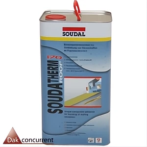 Pu daklijm Soudatherm Roof 170 van de firma Soudal is een oplosmiddelvrije, vochtuithardende ééncomponent isolatielijm op basis van polyurethaan voor het verlijmen van isolatiematerialen op het dak. De Pu lijm is enkel voor professioneel gebruik, opleiding is noodzakelijk. De Pu daklijm is geschikt voor het lijmen van Pir/Pur, Eps, minerale isolatie, Xps en steenwol. De lijm is geschikt voor steenachtige, metalen, houten en bitumineuze ondergronden. Pu daklijm voor isolatie is leverbaar in blikken van 5,5 kg. Het verbruik bedraagt afhankelijk van de ondergrond ca. 150-200 gram/m² in het dakvlak. In hoek- en randzones is dit het dubbele. Bij twijfel neem contact met ons op.